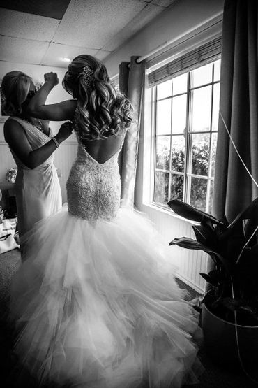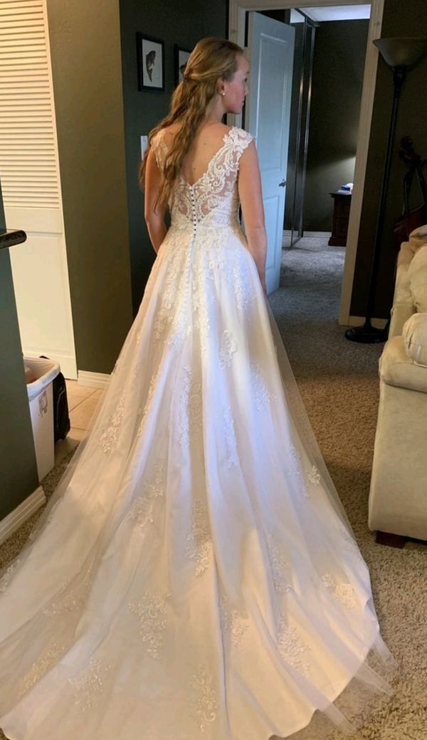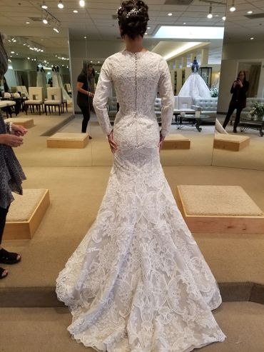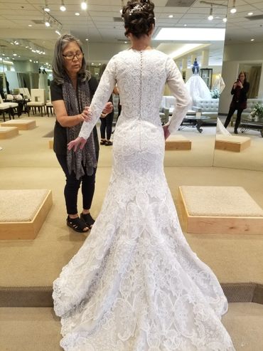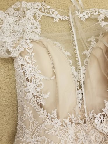 Hard to believe this dress started out as a size 20 strapless dress! Sarah ordered extra fabric at the time of ordering her gown since she knew she wanted to have sleeves added and the front to no longer be strapless. Together we created a beautiful gown of her dreams.