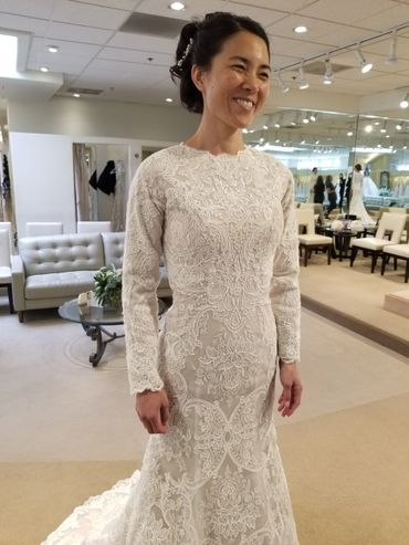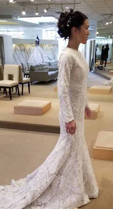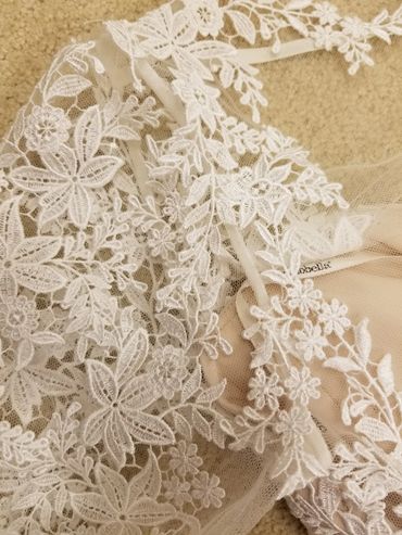 Sandy had purchased her gown from a bridal boutique. However, due to her religious requirements, she needed the front, back, and sleeves to be lined rather than see through. The Re-Design change still makes for a gorgeous gown!